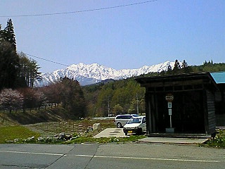 後ろに見える雪かぶった山は北アルプスです。